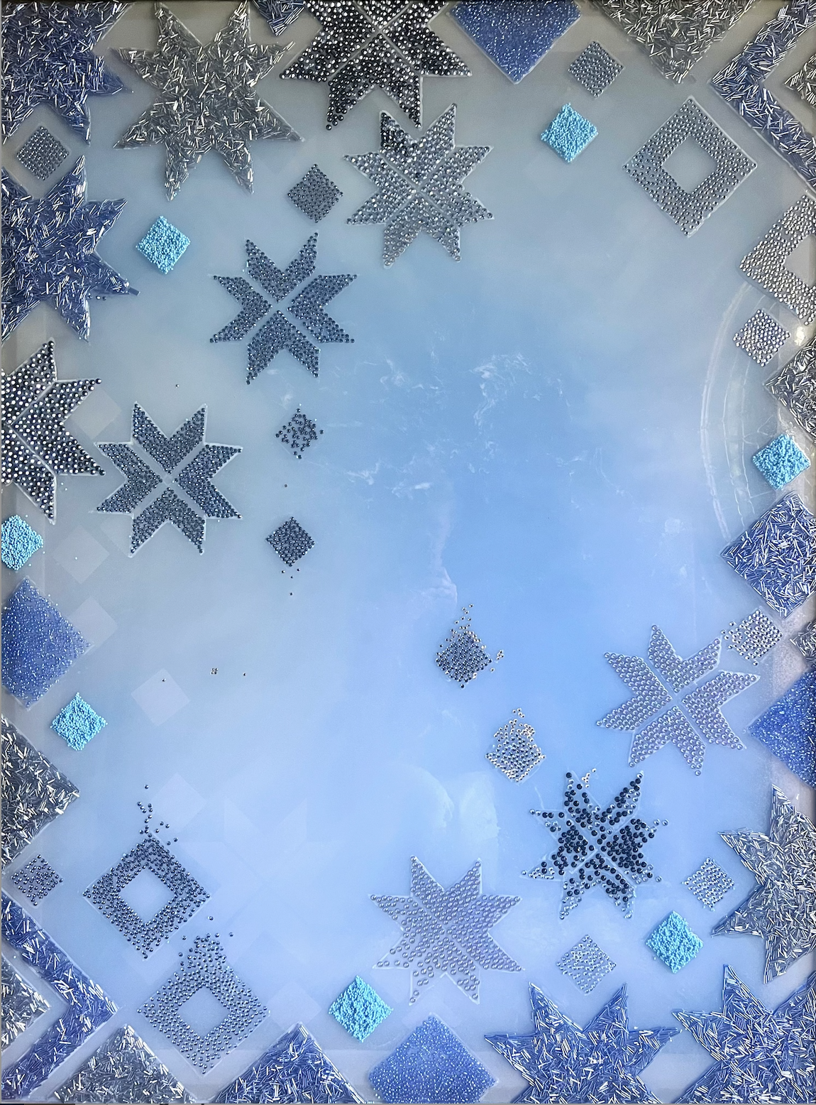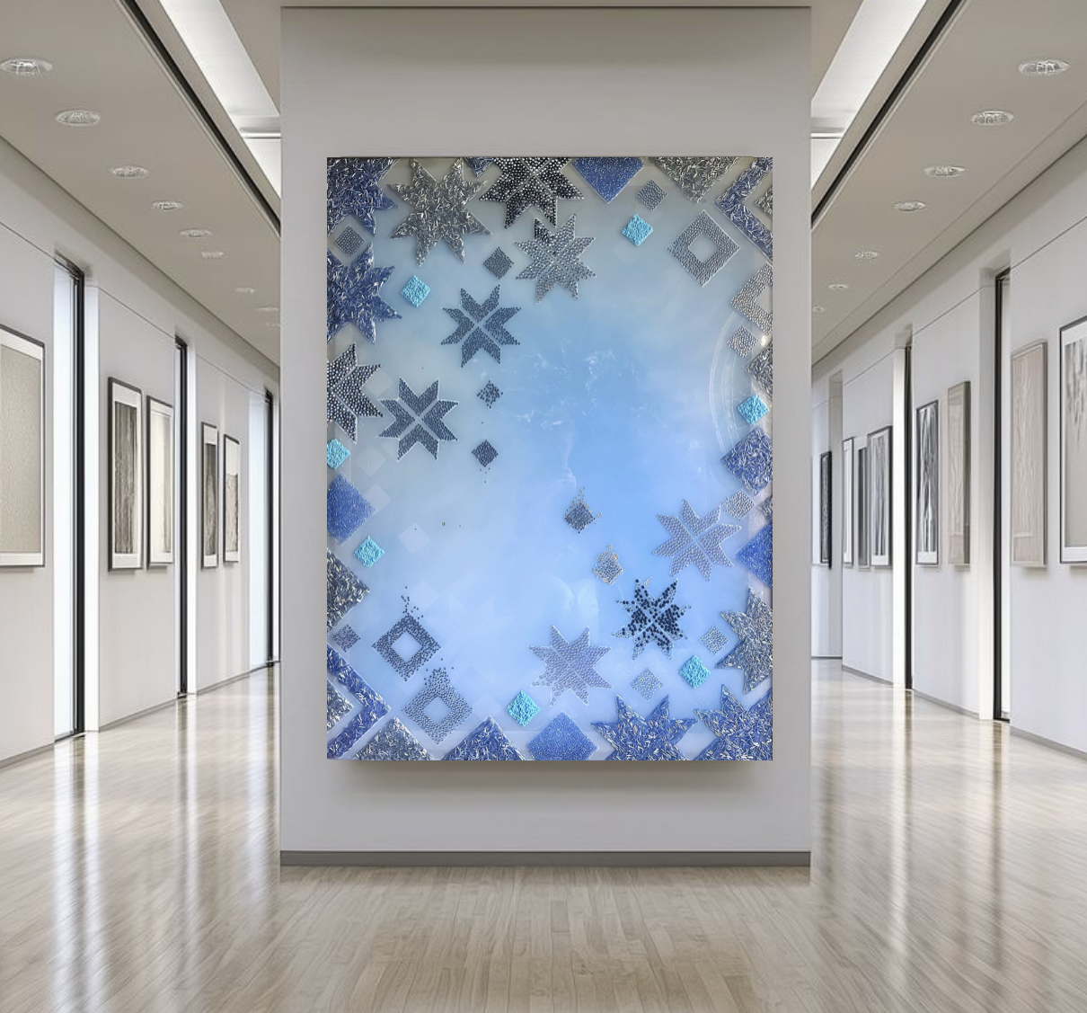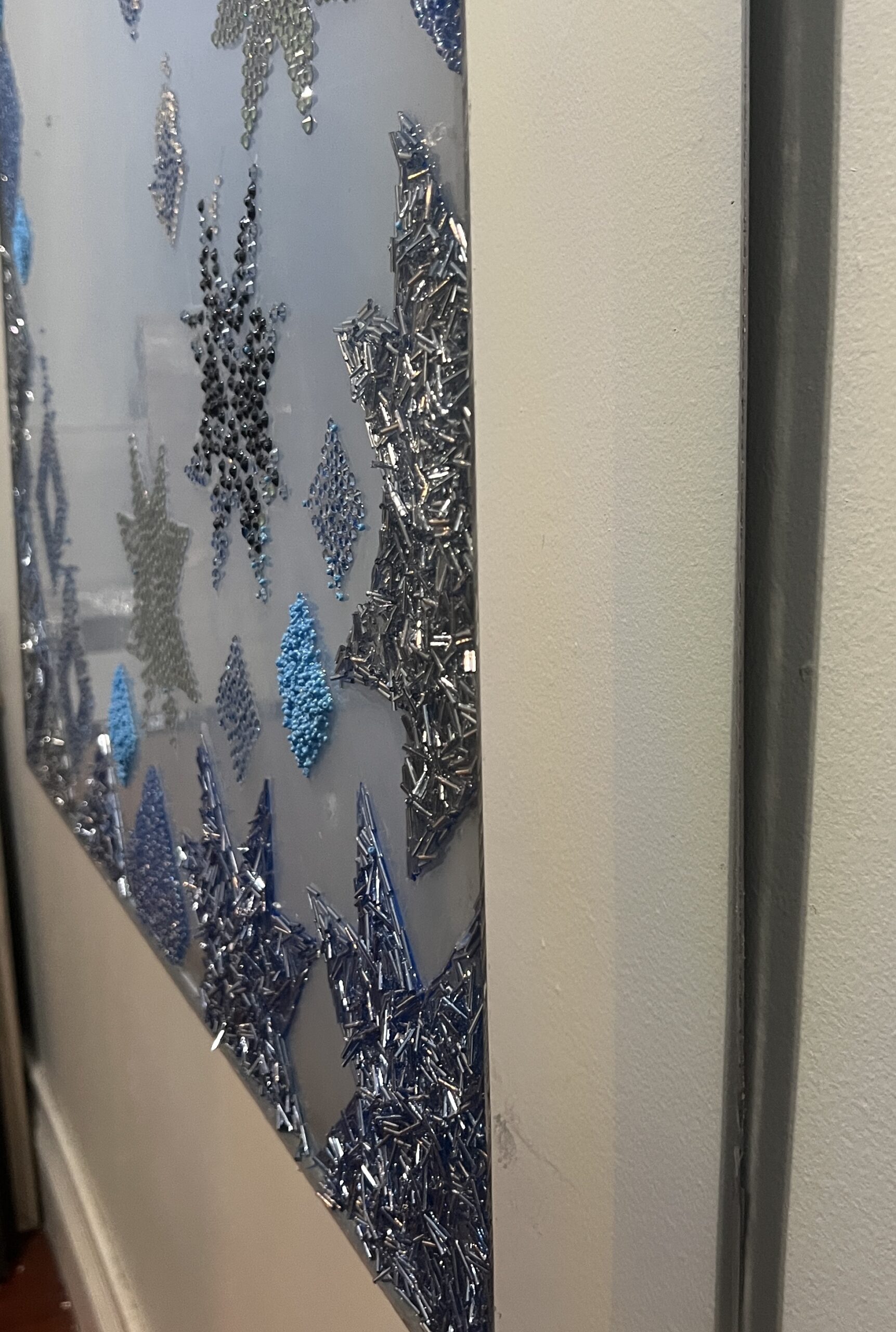 Mixed Media LED Installation Art – mosaic of crystals, beads, epoxy resin on plexiglass. Gold plexiglass mirror. LED installed inside with option to manage 60 millions of shade by Phone App. Signed and Dated on the back