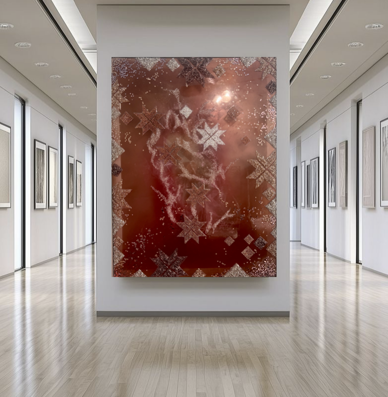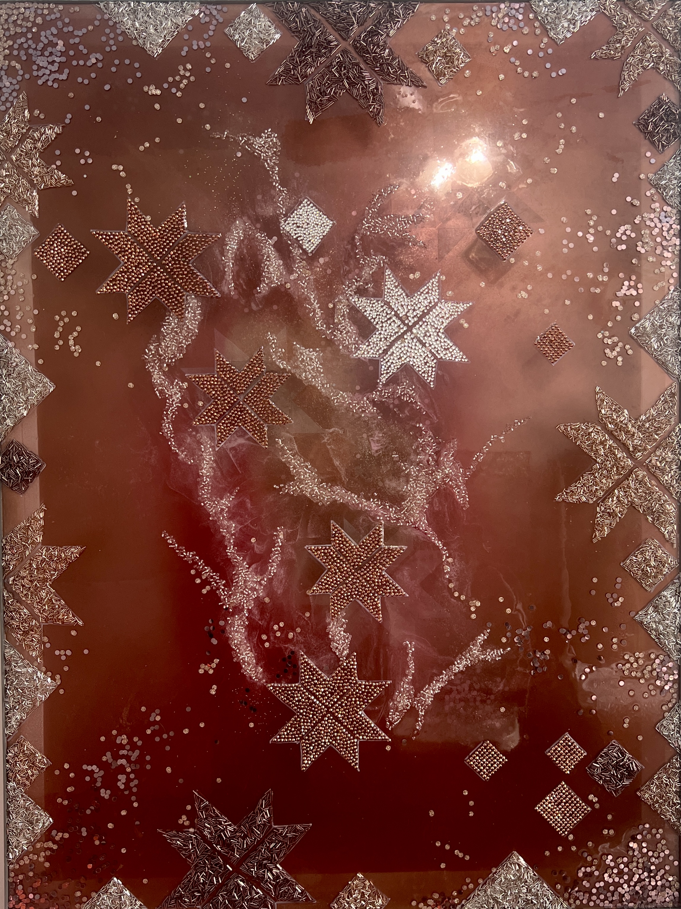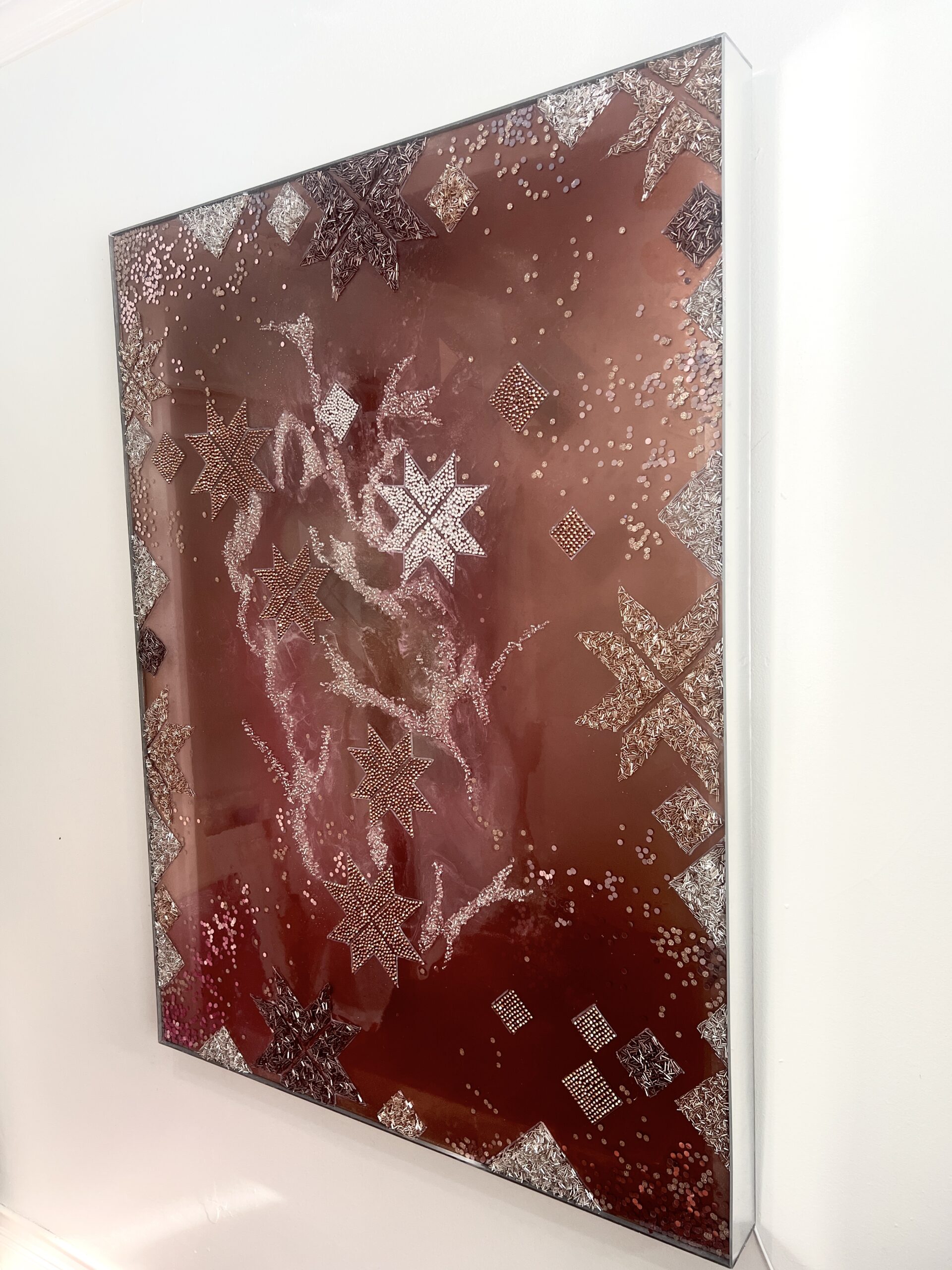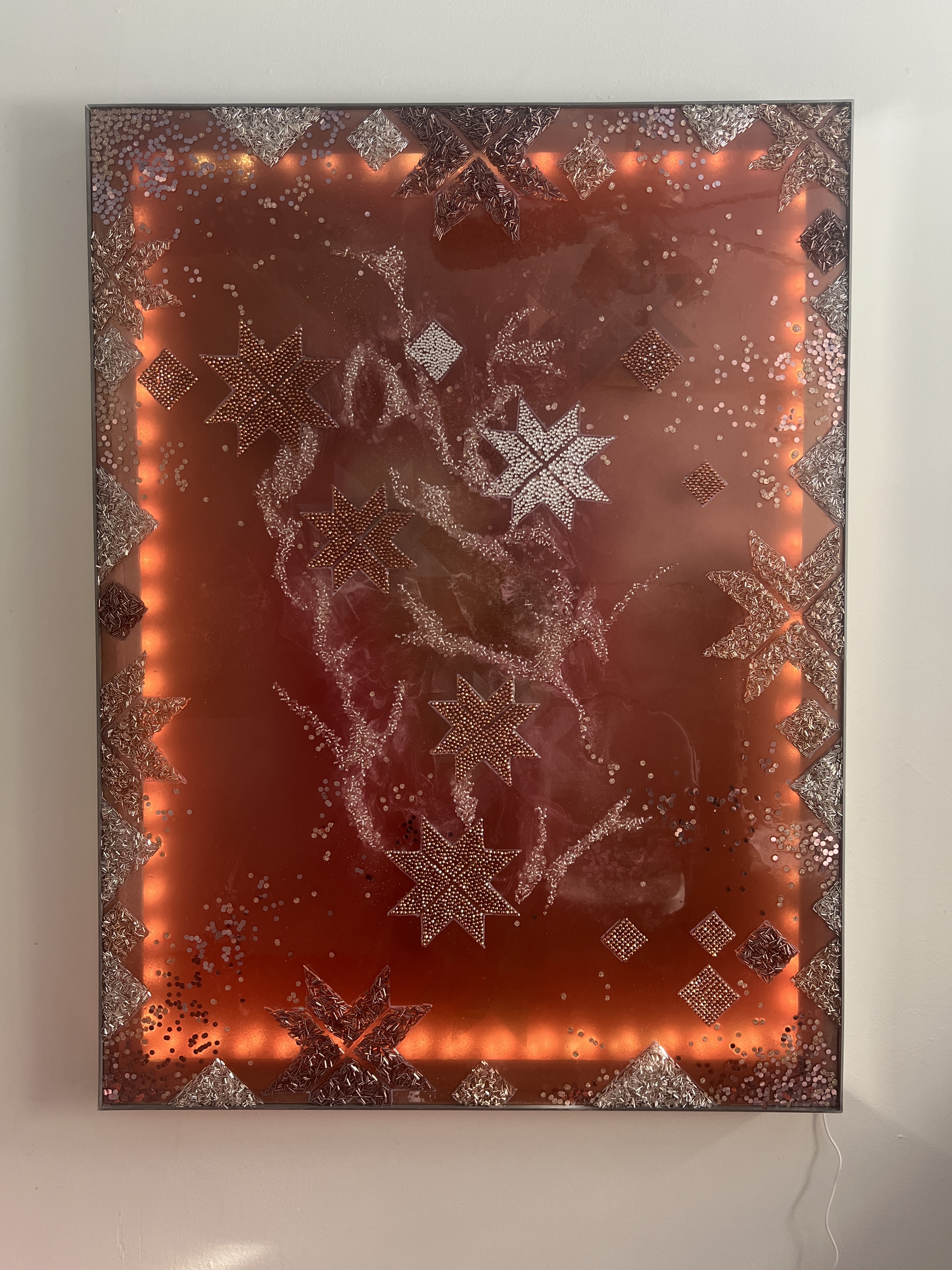 Mixed Media LED Installation Art – mosaic of crystals, beads, epoxy resin on plexiglass. Gold plexiglass mirror. LED installed inside with option to manage 60 millions of shade by Phone App. Signed and Dated on the back
